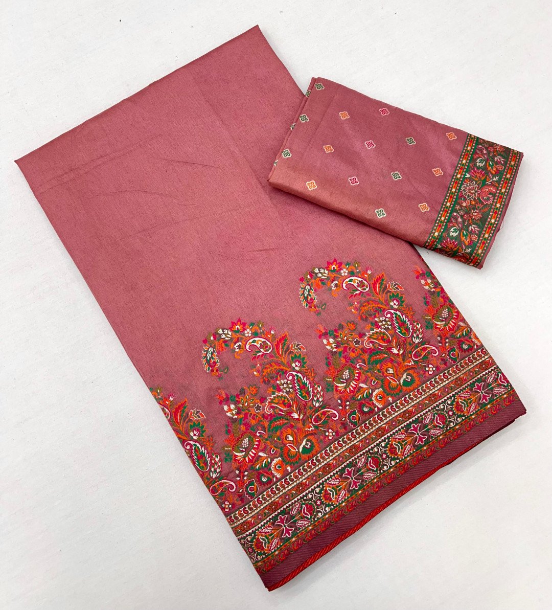 A mannequin displays a traditional South Asian saree featuring a white fabric with golden polka dots and a bold red border. The saree is adorned with intricate gold jewelry, including a necklace and a waist belt. The background appears to be a richly decorated interior with ambient lighting.